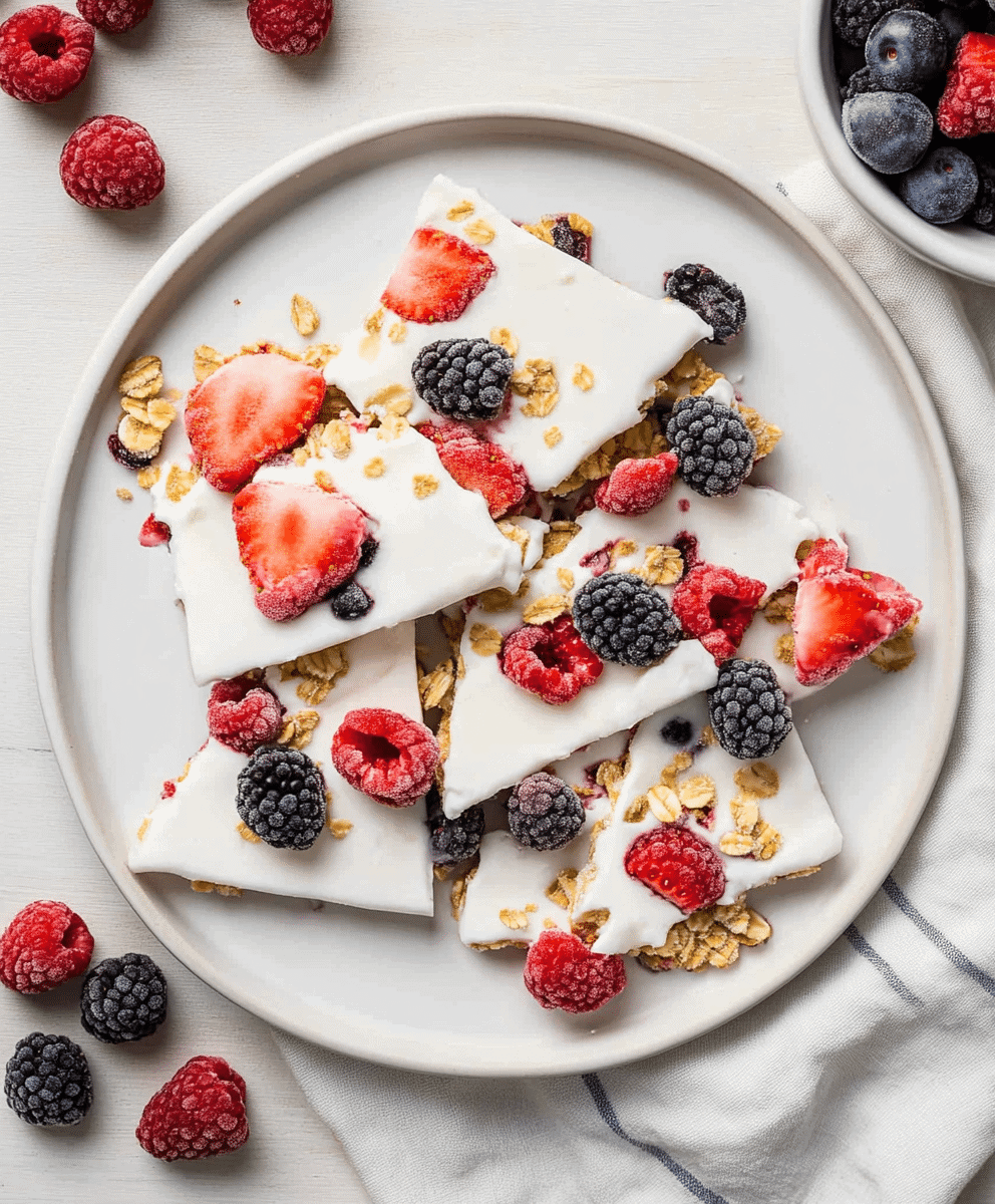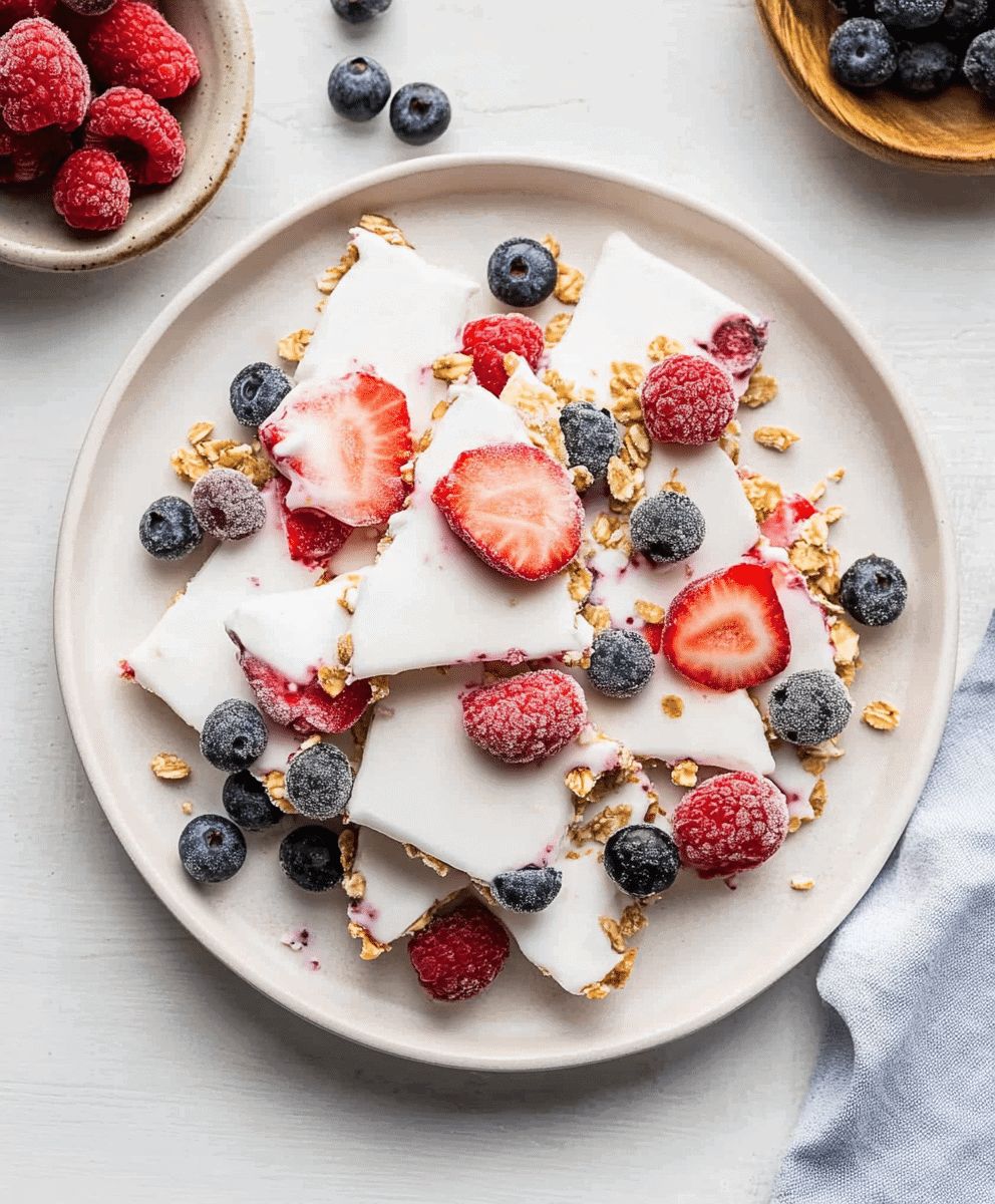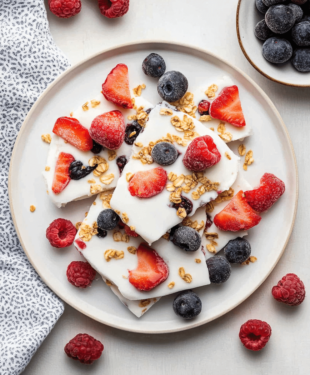 Now comes the fun part: topping! Scatter your berries evenly over the yogurt, pressing them in just slightly so they stick as the bark freezes. Follow with a handful of granola, and if you’re feeling fancy, a sprinkle of shredded coconut or mini chocolate chips.