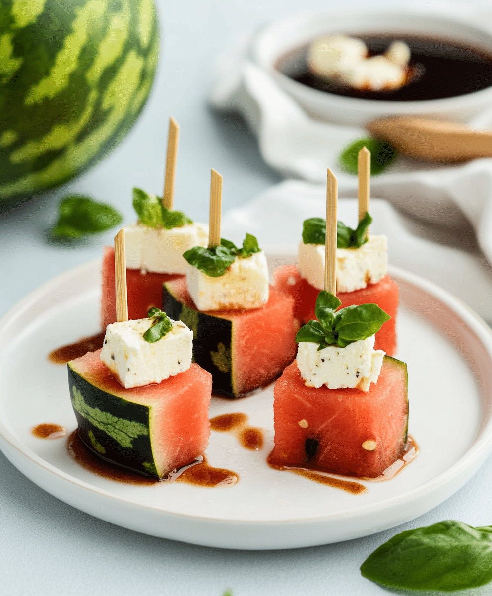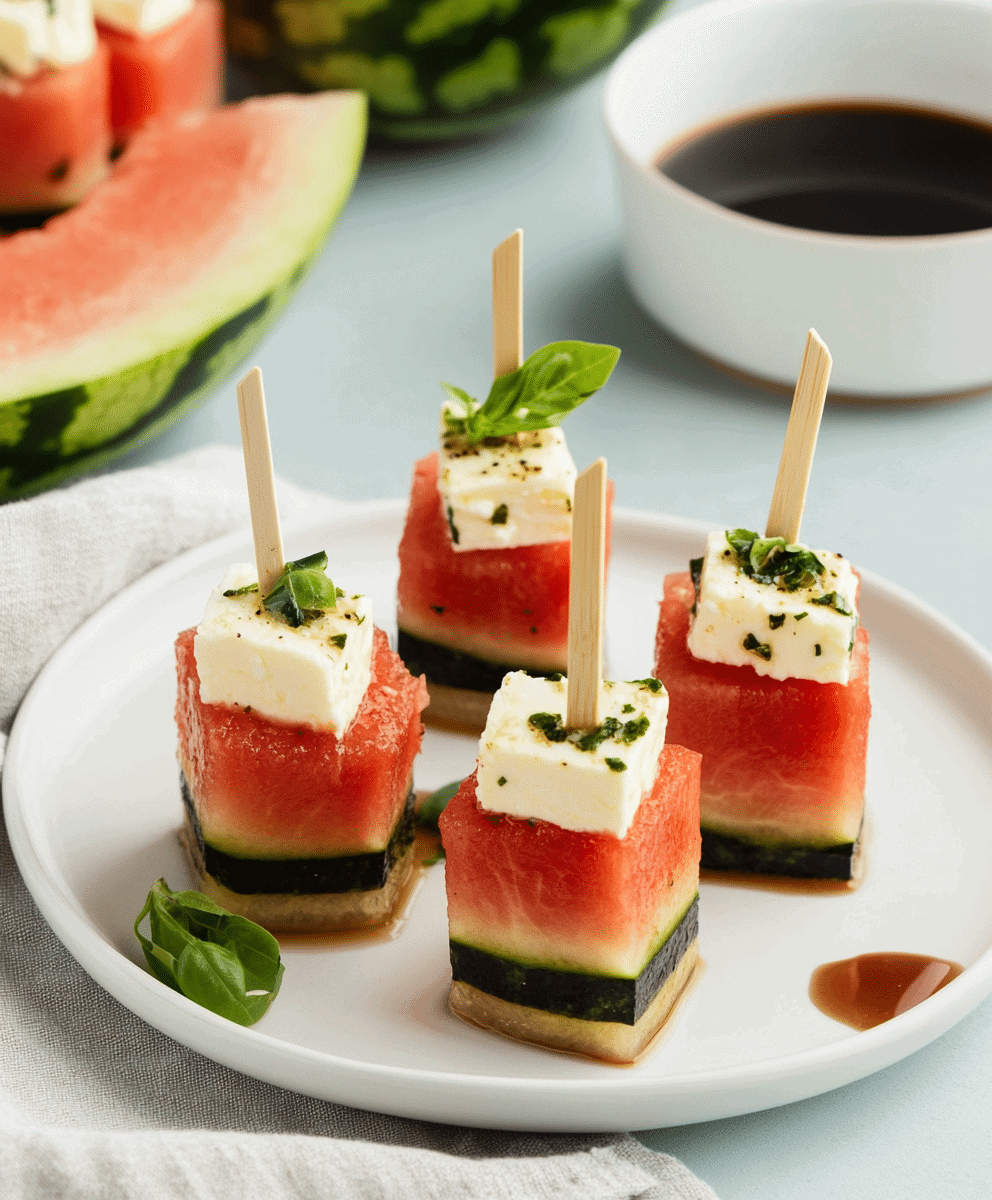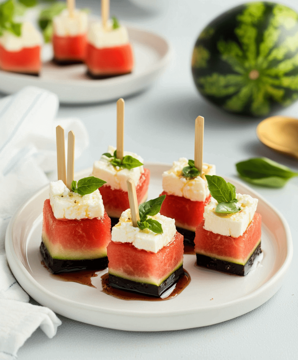 There’s something undeniably joyful about biting into an ice-cold cube of watermelon on a hot summer day. Add a touch of creamy feta, a drizzle of balsamic glaze, and a fresh mint leaf—and you’ve got the ultimate no-cook appetizer that’s as elegant as it is refreshing.